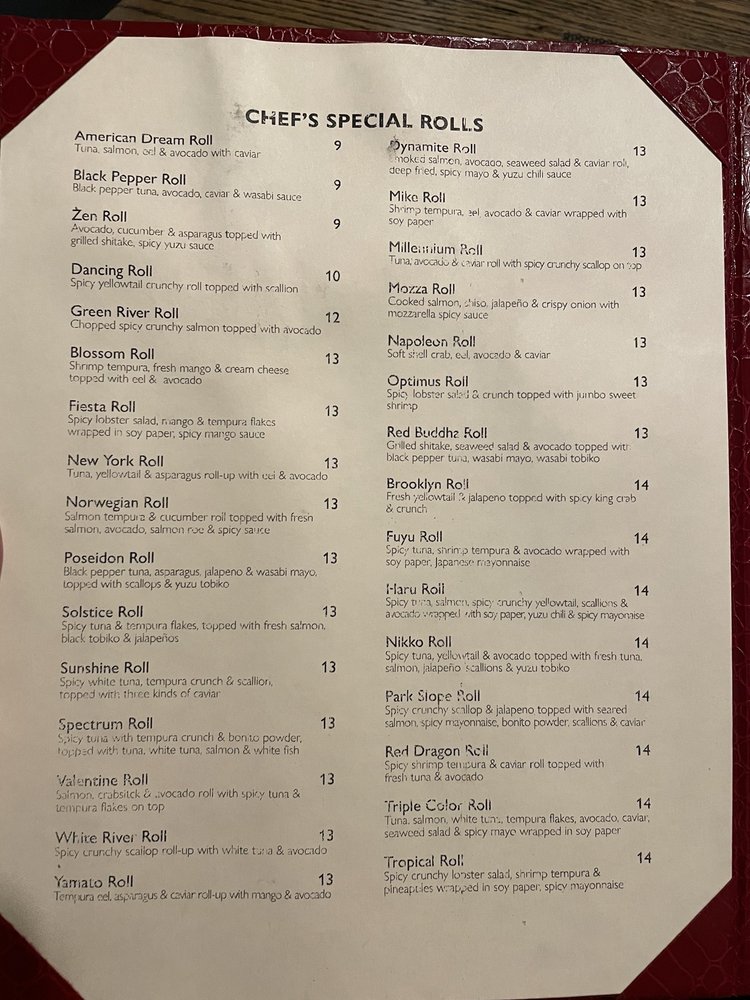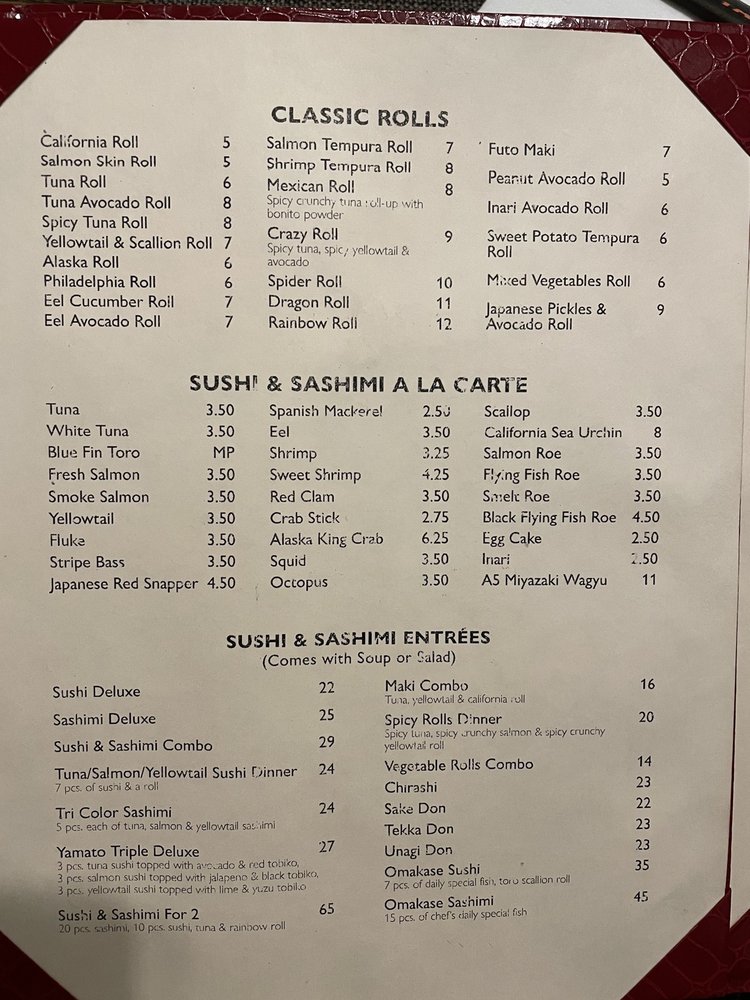 Yamato in Brooklyn is the go-to spot for Japanese cuisine, specifically known for its sushi and hot appetizers. The menu offers a wide variety of options, including fresh salads like Avocado Salad and Seared Tuna Salad, along with flavorful soups like Hot & Sour Chicken Soup and Miso Soup. For appetizers, you can enjoy favorites like Baked Seafood, Chicken & Beef Satay, and Duck Lettuce wraps. The cold appetizers are equally delectable, with unique dishes like Duo Tar Tar and Lobster Spring Roll. Yamato's sophisticated ambiance and attentive service make it a great choice for a casual dinner or special occasion. Whether you're a sushi aficionado or just looking to try something new, Yamato's diverse menu and inviting atmosphere are sure to impress.